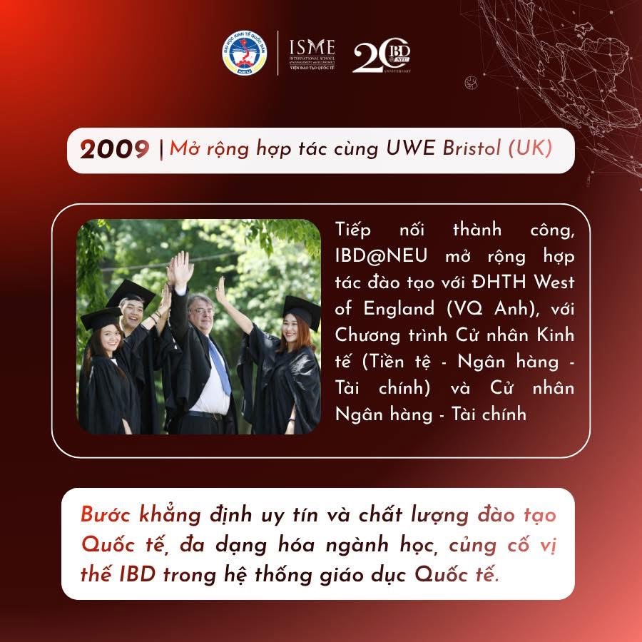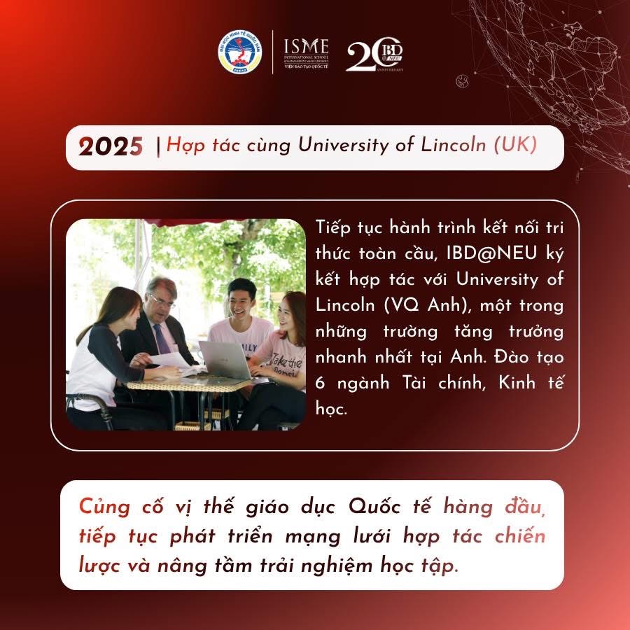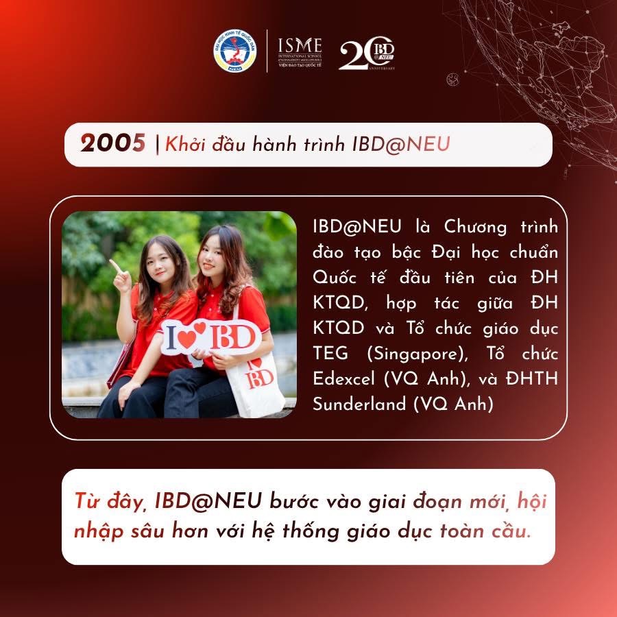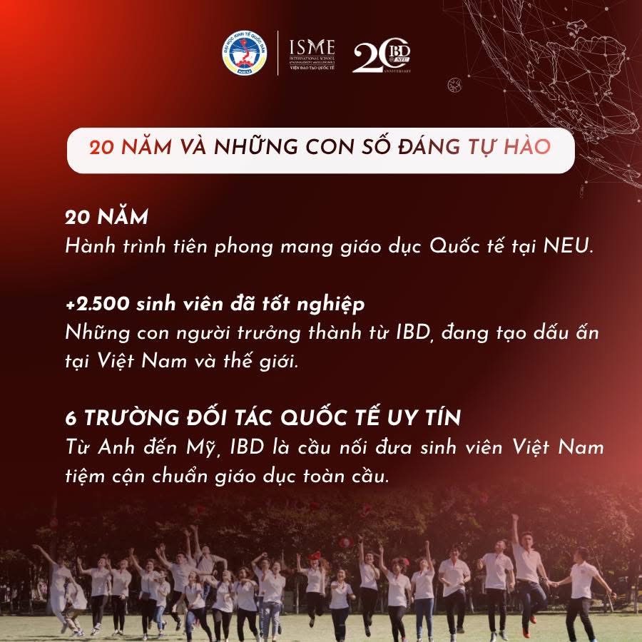 ✨ Hai thập kỷ trôi qua, nhìn lại, IBD@NEU không chỉ mở rộng quy mô, ngành học và đối tác, mà còn không ngừng khẳng định chất lượng đào tạo – uy tín học thuật – giá trị tri thức toàn cầu.