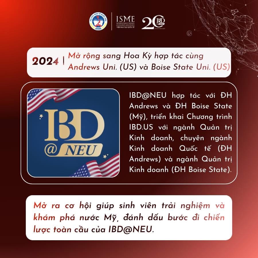 ✨ Hai thập kỷ trôi qua, nhìn lại, IBD@NEU không chỉ mở rộng quy mô, ngành học và đối tác, mà còn không ngừng khẳng định chất lượng đào tạo – uy tín học thuật – giá trị tri thức toàn cầu.