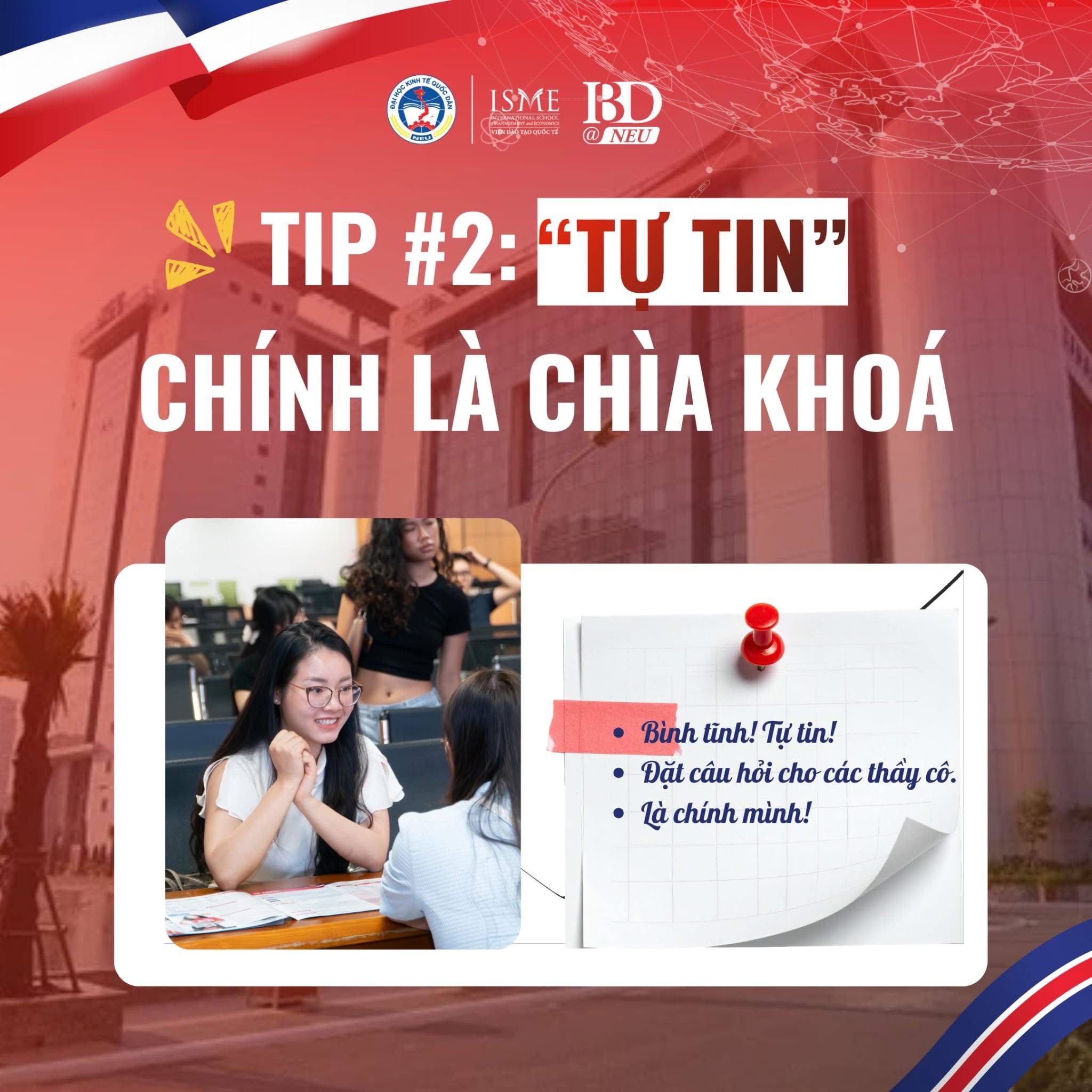 Sự tự tin và bình tĩnh là yếu tố giúp bạn thể hiện rõ nhất chính mình trong buổi phỏng vấn. Đừng ngần ngại đặt câu hỏi và chia sẻ suy nghĩ cá nhân, bởi hội đồng phỏng vấn luôn mong muốn lắng nghe những góc nhìn chân thành và tinh thần chủ động học hỏi của các bạn. Hãy là chính mình, vì sự tự tin chính là điểm cộng lớn nhất trong hành trình chinh phục IBD@NEU!