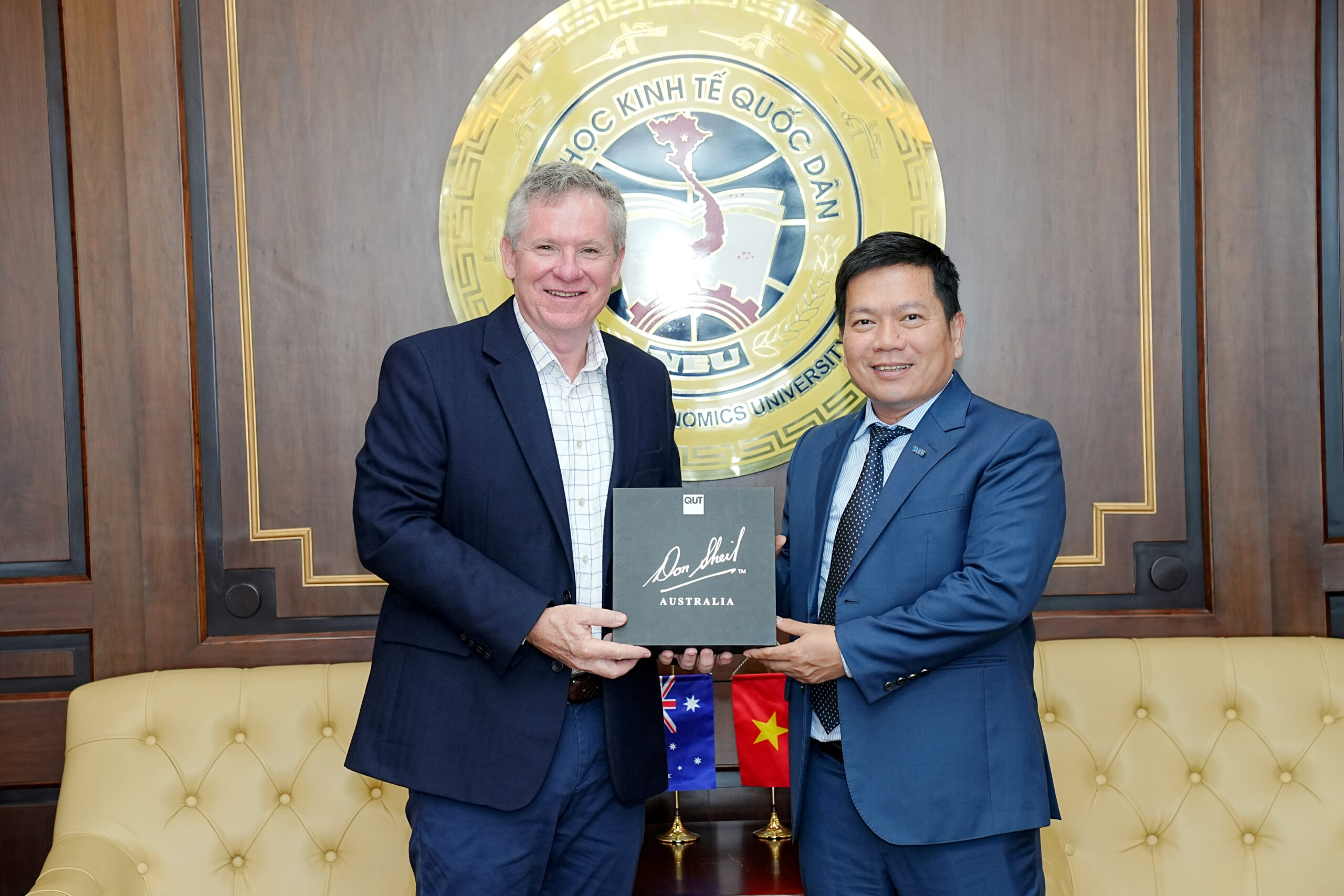 Đại diện ĐHKTQD và Queensland University of Technology tiến hành nghi thức trao thoả thuận hợp tác