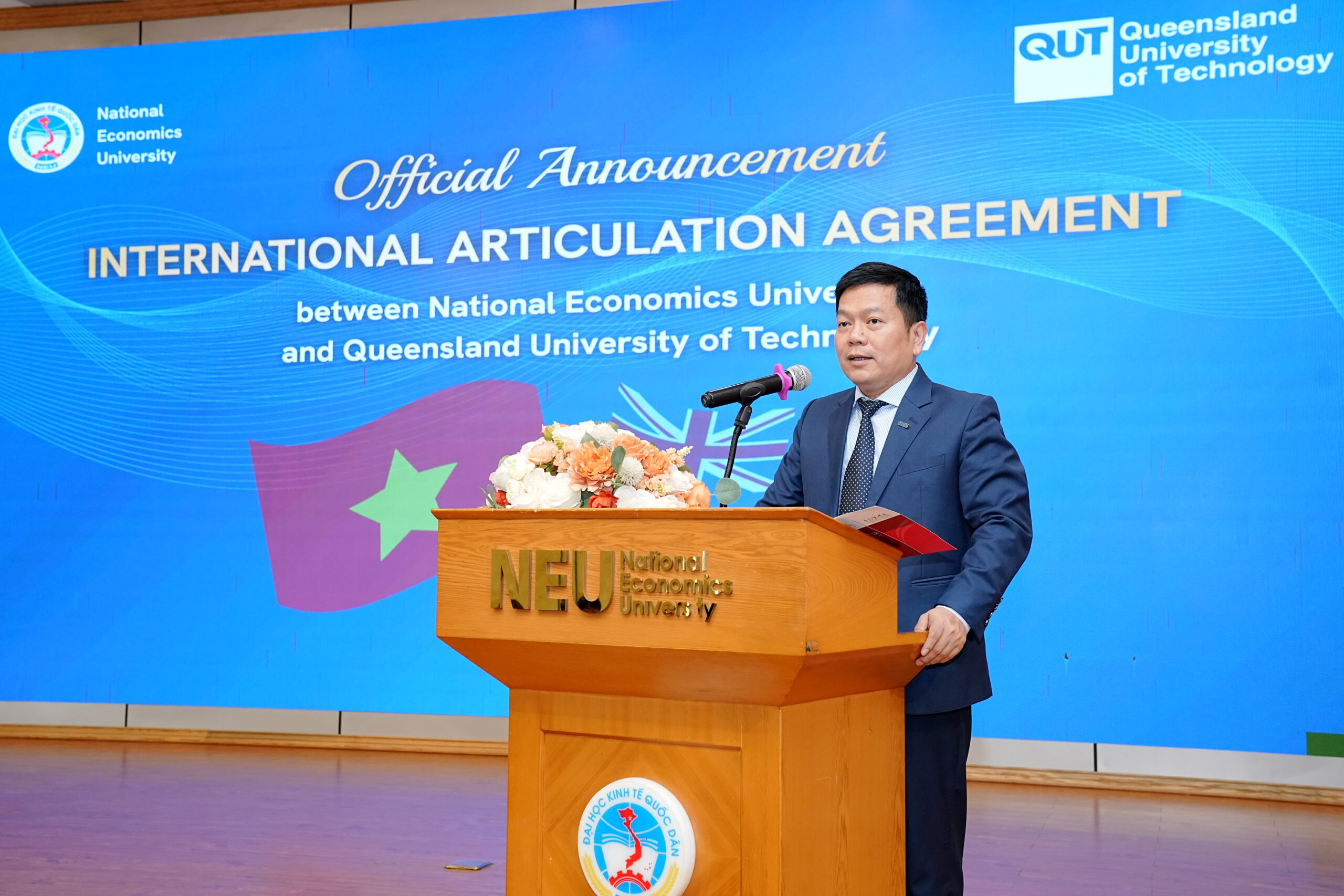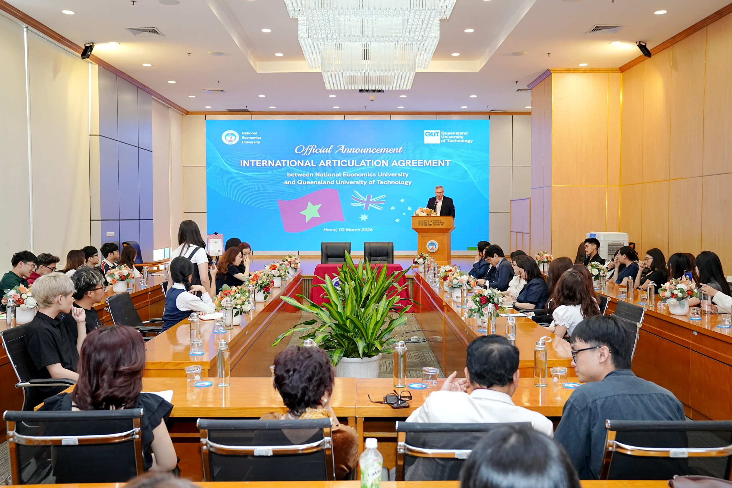 Sáng ngày 02/03/2026, Viện Đào tạo Quốc tế – Đại học Kinh tế Quốc dân (ISME@NEU) trang trọng công bố thỏa thuận hợp tác giữa Đại học Kinh tế Quốc dân (ĐHKTQD) và Queensland University of Technology (QUT). Sự kiện đánh dấu bước tiến chiến lược trong lộ trình quốc tế hóa đào tạo, đồng thời tiếp tục nối dài hành trình gần 30 năm phát triển và hội nhập của Viện ĐTQT – ĐH KTQD với các cơ sở giáo dục uy tín hàng đầu trên thế giới.