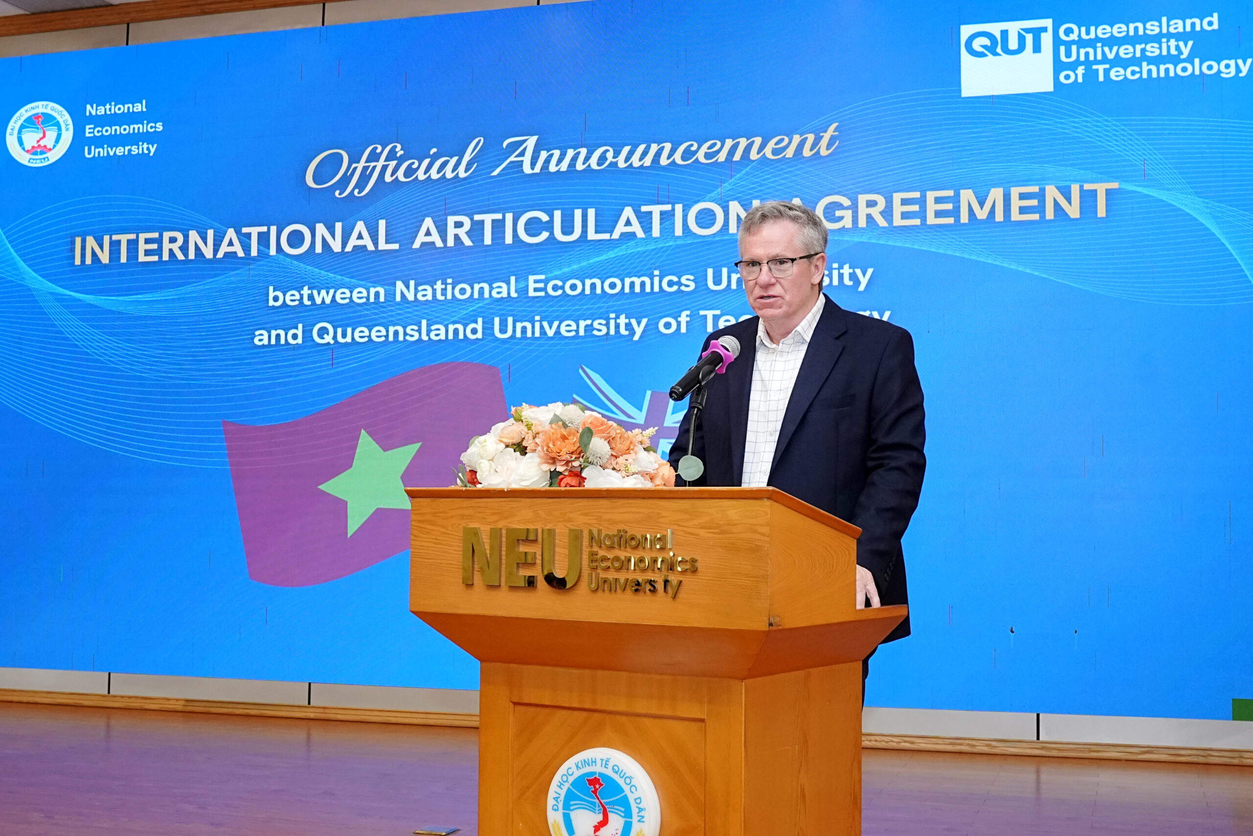 Đáp lại sự đón tiếp nồng hậu từ phía ĐHKTQD, GS. Mark Harvey – Phó Hiệu trưởng QUT bày tỏ niềm tự hào khi QUT trở thành đối tác chiến lược của một ngôi trường có bề dày lịch sử và uy tín hàng đầu như ĐHKTQD. GS. Mark Harvey nhấn mạnh rằng QUT luôn coi trọng việc xây dựng mối quan hệ bền vững với các đối tác tin cậy tại Việt Nam nhằm chia sẻ tầm nhìn chung về đổi mới sáng tạo và giáo dục thực hành. Với vị thế là một trường đại học chú trọng vào việc gắn kết với doanh nghiệp, QUT tin tưởng sự hợp tác này sẽ giúp sinh viên ĐHKTQD trang bị tư duy và kỹ năng để thành công trong một thế giới không ngừng biến đổi.