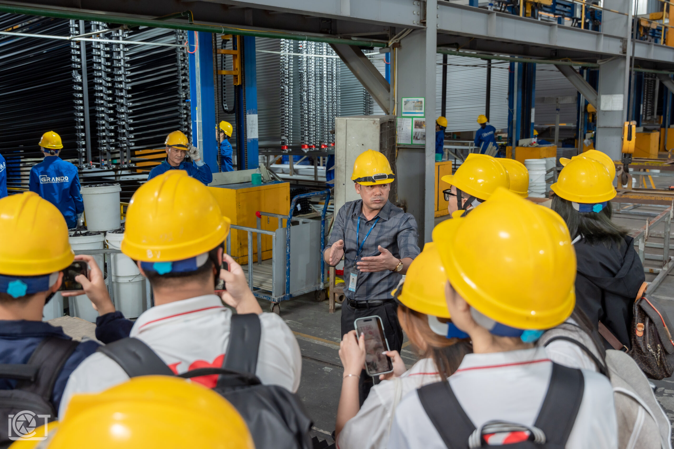 Sau buổi giao lưu, sinh viên được tham quan trực tiếp văn phòng làm việc và toàn bộ dây chuyền sản xuất hiện đại. Môi trường làm việc chuyên nghiệp, cơ sở vật chất hiện đại và không gian sản xuất được tổ chức khoa học đã để lại ấn tượng sâu sắc trong lòng các bạn. Từ khâu gia công nguyên liệu nhôm thô, qua các công đoạn định hình, đùn ép, gia nhiệt, đến bước hoàn thiện và kiểm tra chất lượng sản phẩm – mỗi giai đoạn đều được giới thiệu chi tiết và chuyên nghiệp.