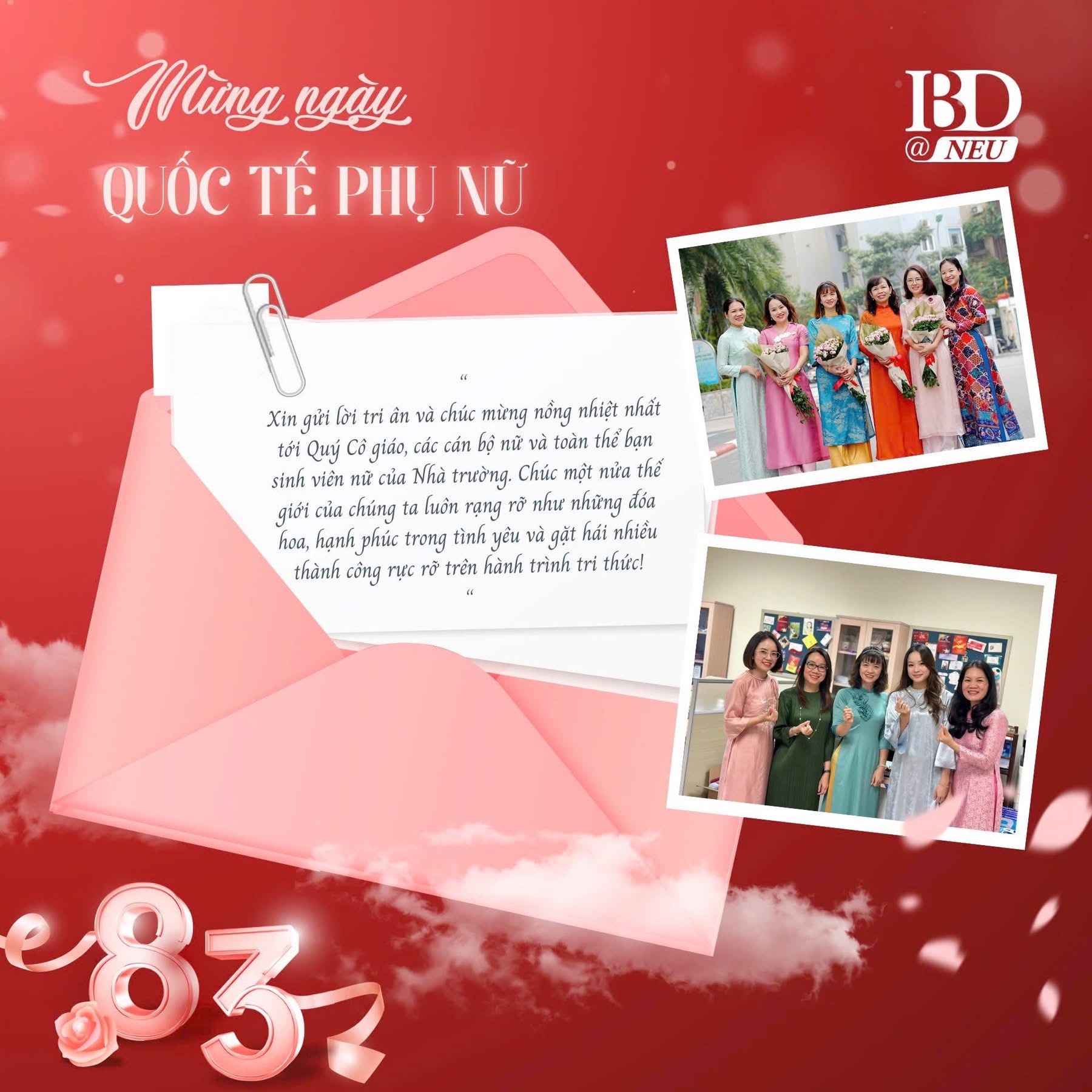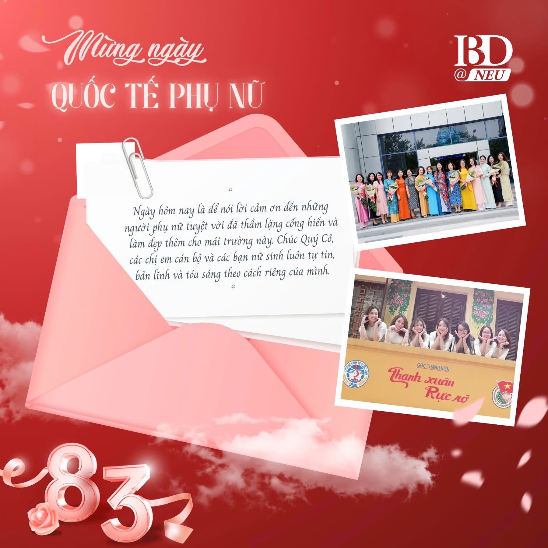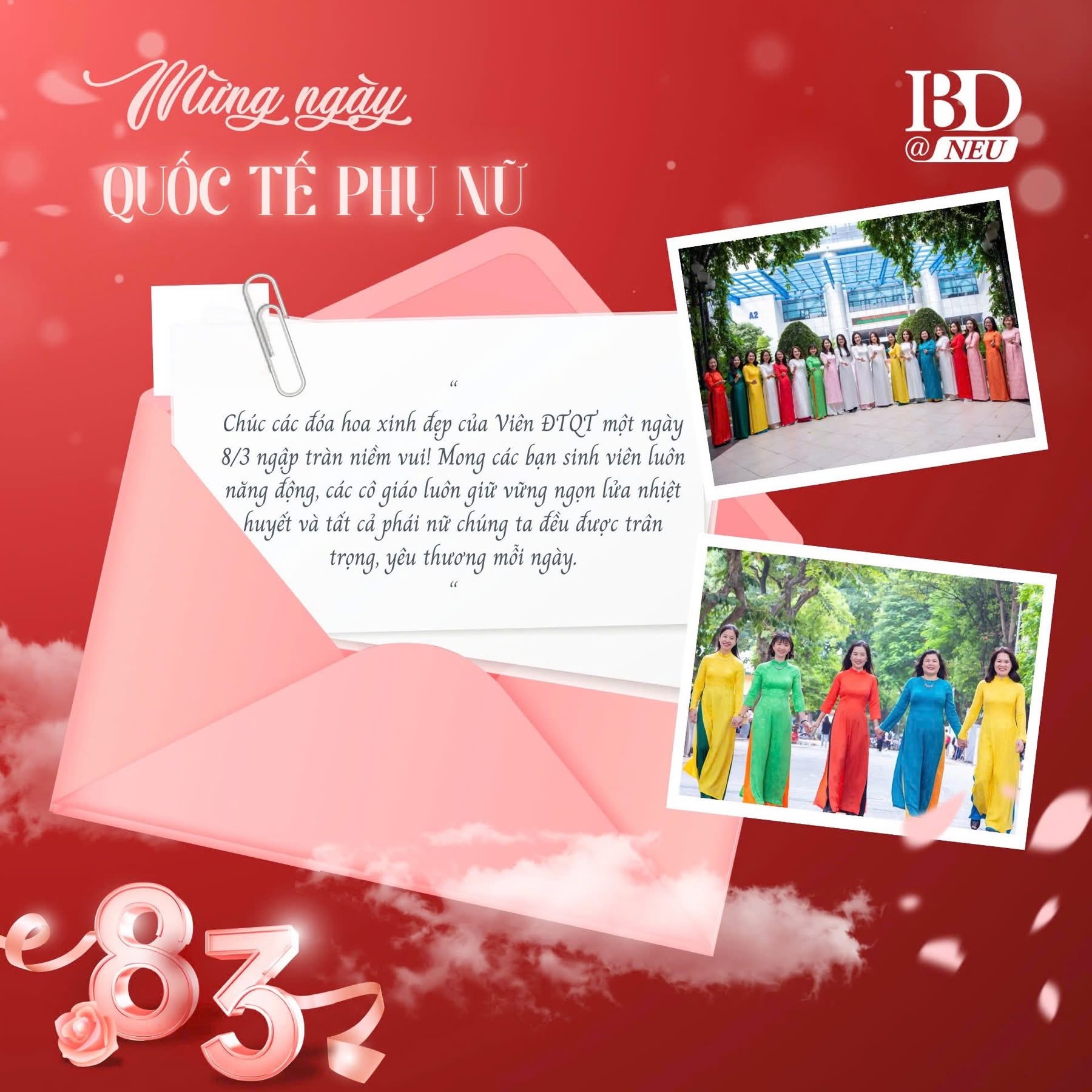 ISME@NEU xin gửi tới một nửa xinh đẹp của thế giới những lời chúc tốt đẹp nhất. Chúc các nữ cán bộ giảng viên và các bạn sinh viên nữ tại Viện luôn tươi tắn như những bông hoa trong nắng sớm, tự tin tỏa sáng theo cách của riêng mình ✨