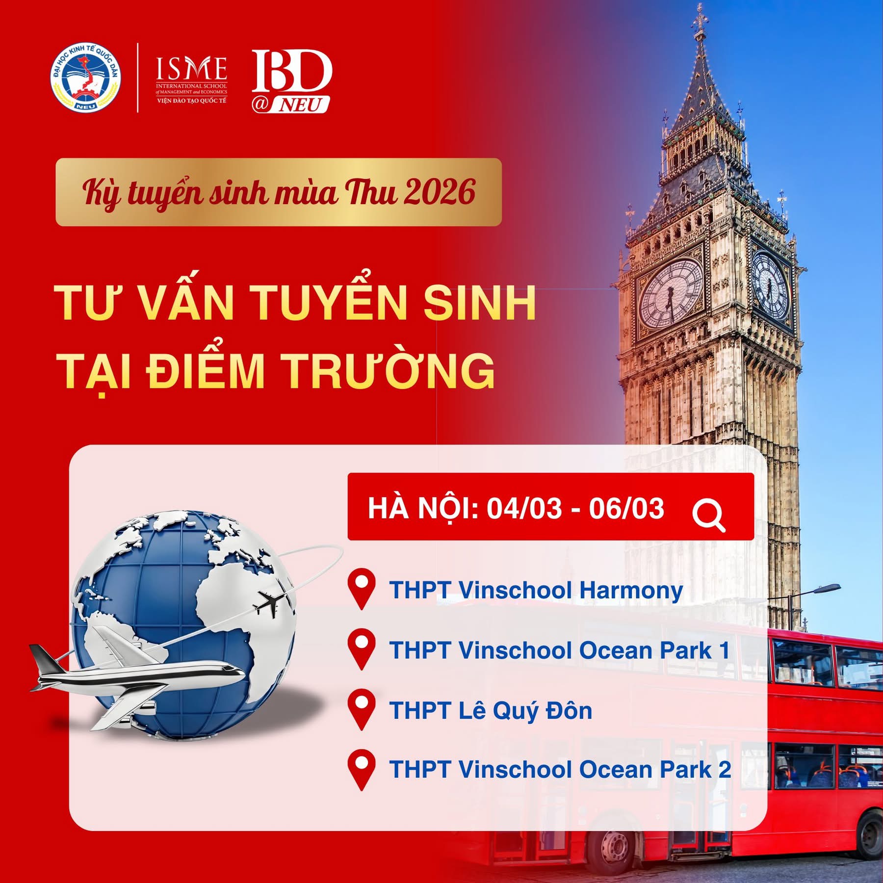📌 Từ ngày 04/03/2026 đến 06/03/2026, IBD@NEU đã có mặt tại các ngày hội tư vấn tuyển sinh do THPT Vinschool The Harmony, THPT Vinschool Ocean Park 1, THPT Lê Quý Đôn – Đống Đa và THPT Vinschool Ocean Park 2 tổ chức. Tại các sự kiện, gian tư vấn của IBD@NEU đã thu hút đông đảo học sinh ghé thăm để tìm hiểu về chương trình đào tạo, môi trường học tập cũng như các thông tin tuyển sinh của chương trình. Đây cũng là dịp để IBD@NEU trực tiếp gặp gỡ, trao đổi và chia sẻ thêm nhiều thông tin hữu ích đến các bạn học sinh trong không khí sôi nổi của các ngày hội hướng nghiệp tại trường.