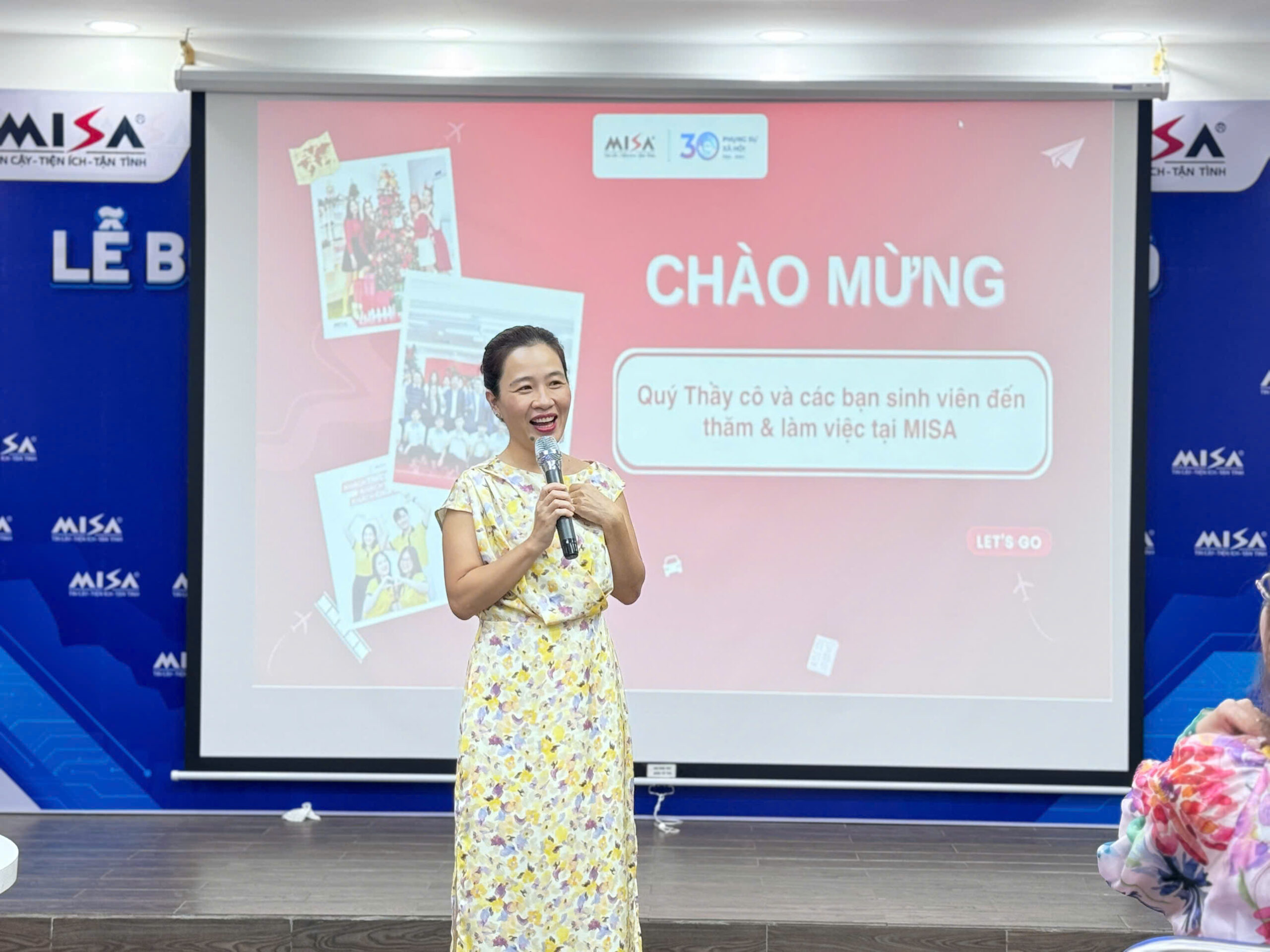 Trong phần phát biểu khai mạc, TS. Lê Thị Hương Lan – Giảng viên Viện ĐTQT gửi lời cảm ơn tới Công ty MISA vì sự đón tiếp chu đáo, đồng thời nhấn mạnh thông điệp sinh viên cần chủ động chuẩn bị hành trang trước những thay đổi của kỷ nguyên AI. Câu hỏi “Bạn đã sẵn sàng chưa?” được cô đặt ra không chỉ cho hoạt động ngày hôm nay mà còn là định hướng xuyên suốt trong môn học Personal & Professional Development, khơi gợi cho sinh viên tinh thần chủ động và ý thức tự hoàn thiện bản thân.