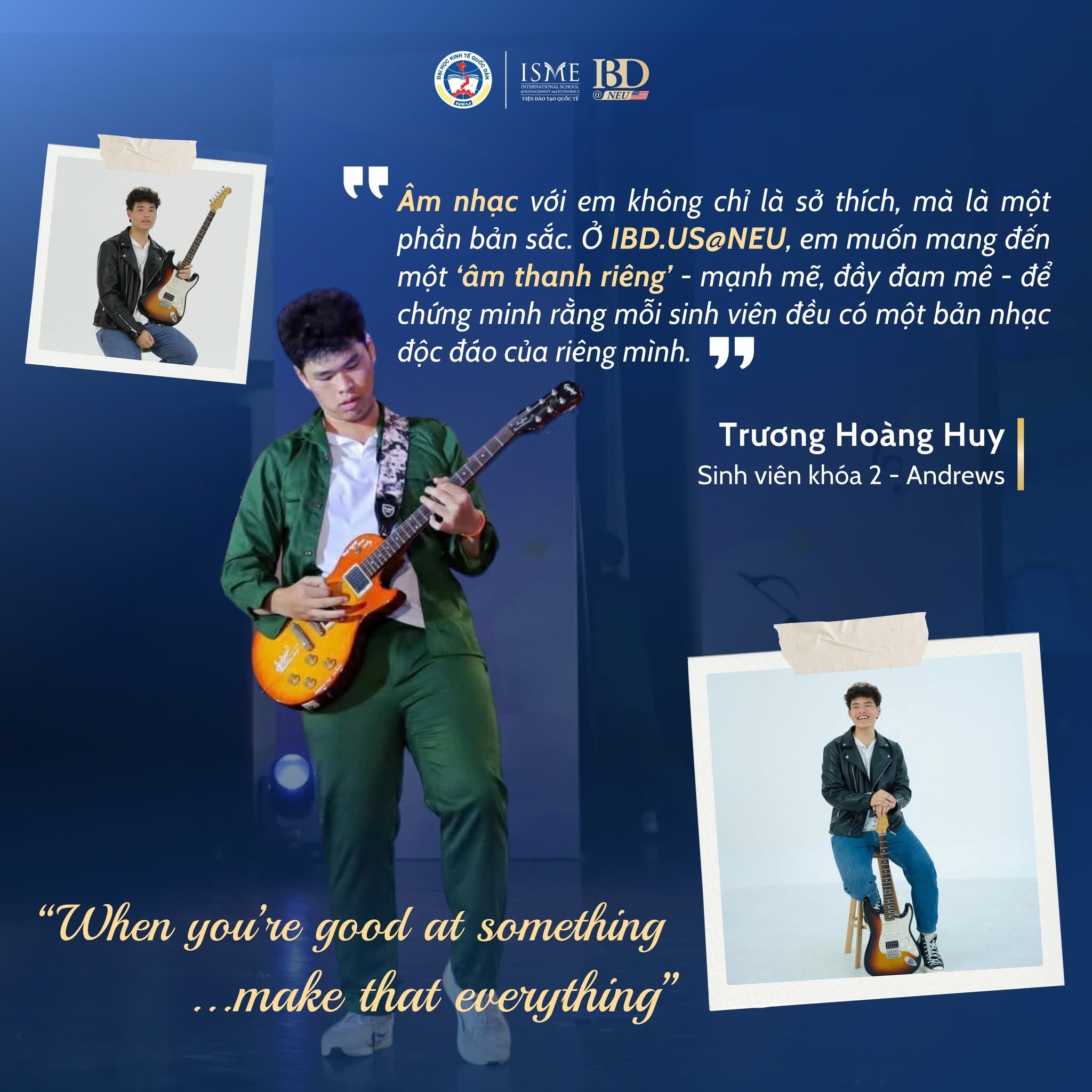 Ở Chương trình Cử nhân Quốc tế IBD_US@NEU, chúng mình tin rằng, mỗi sinh viên đều mang một màu sắc riêng. Có người tìm thấy bản lĩnh qua rèn luyện thể theo, có người gửi gắm cảm xúc bằng âm nhạc, cũng có người lại tìm thấy sự bình yên trong từng nét vẽ và những món đồ thủ công,… Những câu chuyện ấy chỉ là minh chứng nhỏ cho một điều lớn lao hơn: tài năng không chỉ là sở thích, mà là bản sắc, là cách mỗi người tỏa sáng và khẳng định chính mình.
