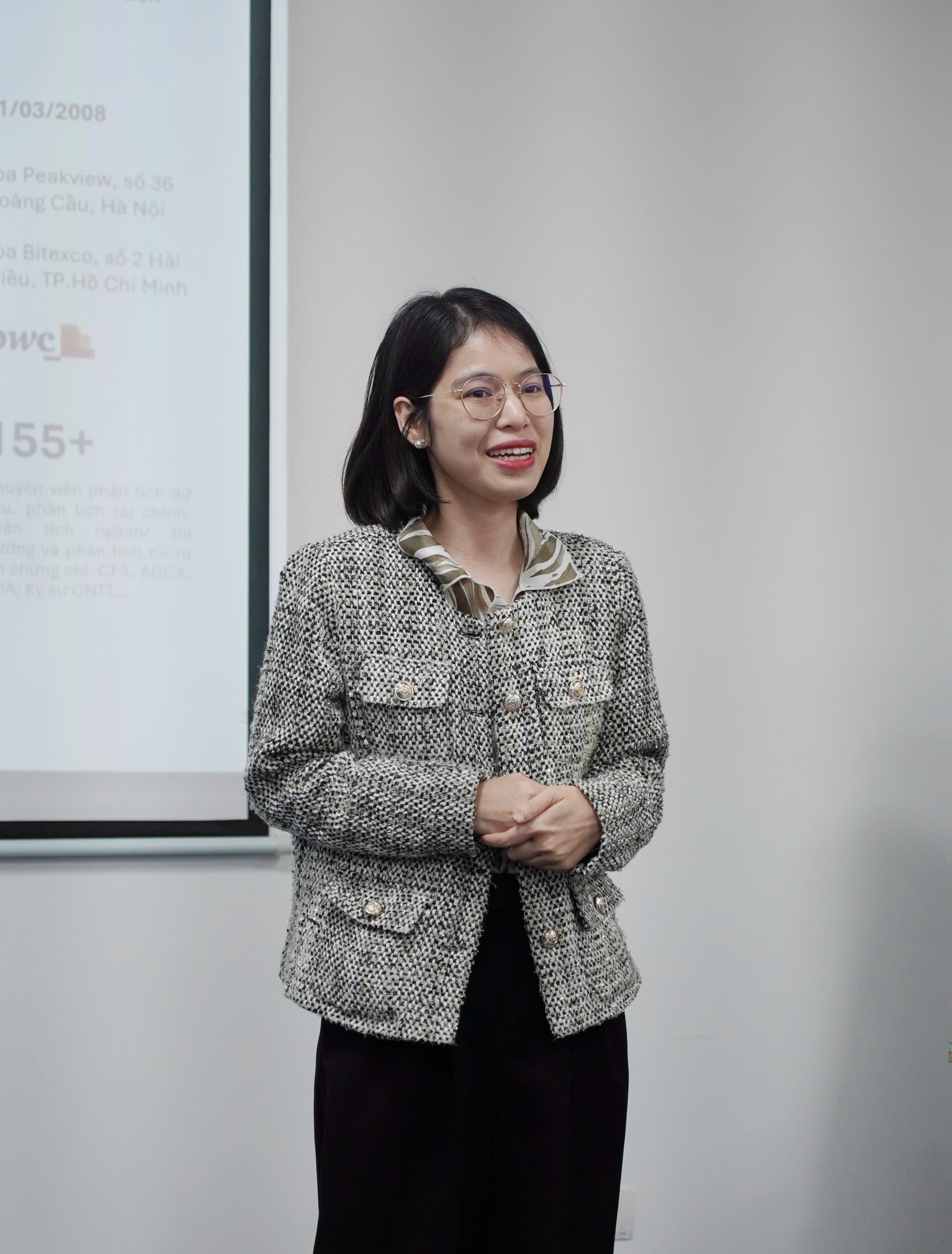 Đại diện bộ phận Nhân sự – chị Nguyễn Thu Quyên đã giới thiệu tổng quan về quá trình hình thành và phát triển của FiinGroup, đồng thời làm rõ các sản phẩm và dịch vụ cốt lõi của doanh nghiệp. Được thành lập trong bối cảnh khủng hoảng tài chính toàn cầu năm 2008, FiinGroup xác định minh bạch dữ liệu là yếu tố nền tảng và tất yếu đối với thị trường tài chính hiện đại. Theo chia sẻ của đại diện doanh nghiệp, việc cung cấp dữ liệu tài chính chính xác, đáng tin cậy không chỉ hỗ trợ nhà đầu tư ra quyết định hiệu quả mà còn góp phần thúc đẩy sự phát triển bền vững của nền kinh tế.