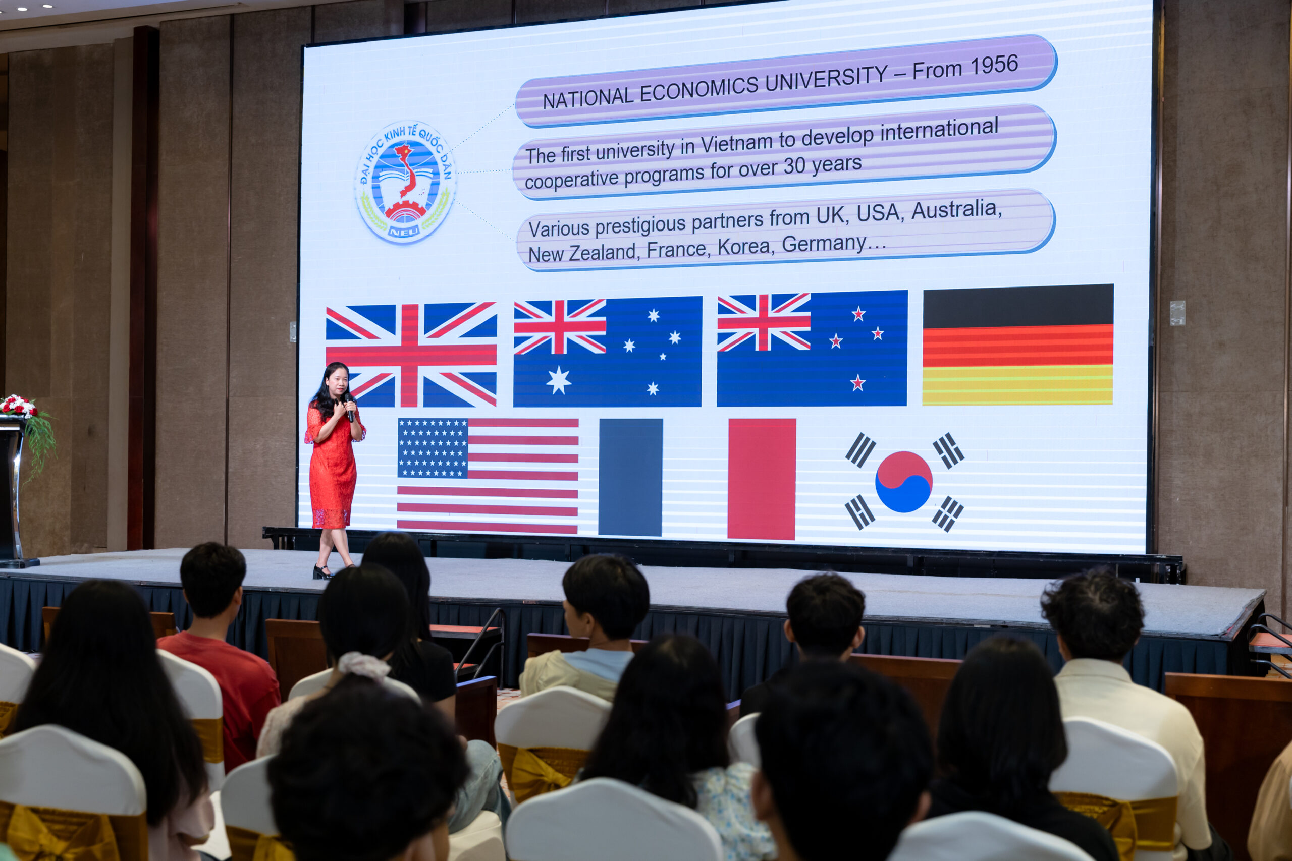 Mở đầu chương trình, đại diện BUC giới thiệu các cơ hội học tập quốc tế, học bổng, điều kiện học tập, môi trường đào tạo, cơ sở vật chất, … tại nhiều quốc gia khác nhau trong đó có thông tin về Đại học Kinh tế Quốc dân (ĐHKTQD), Việt Nam.